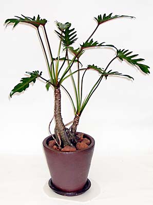 同じサトイモ科のセロウムに似ていますが、クッカバラの方が葉が細長く全体にコンパクトなのが特徴です。貴重な幹上りのクッカバラを重厚な陶器鉢に植えた逸品です。 |